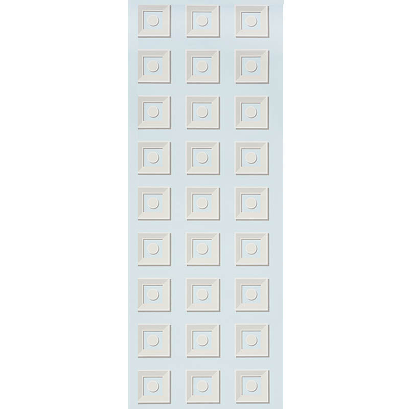 This striking geometric design just begs for the ceiling. Stylized panels with black and white strokes playfully capture architectural detail in two dimensions.