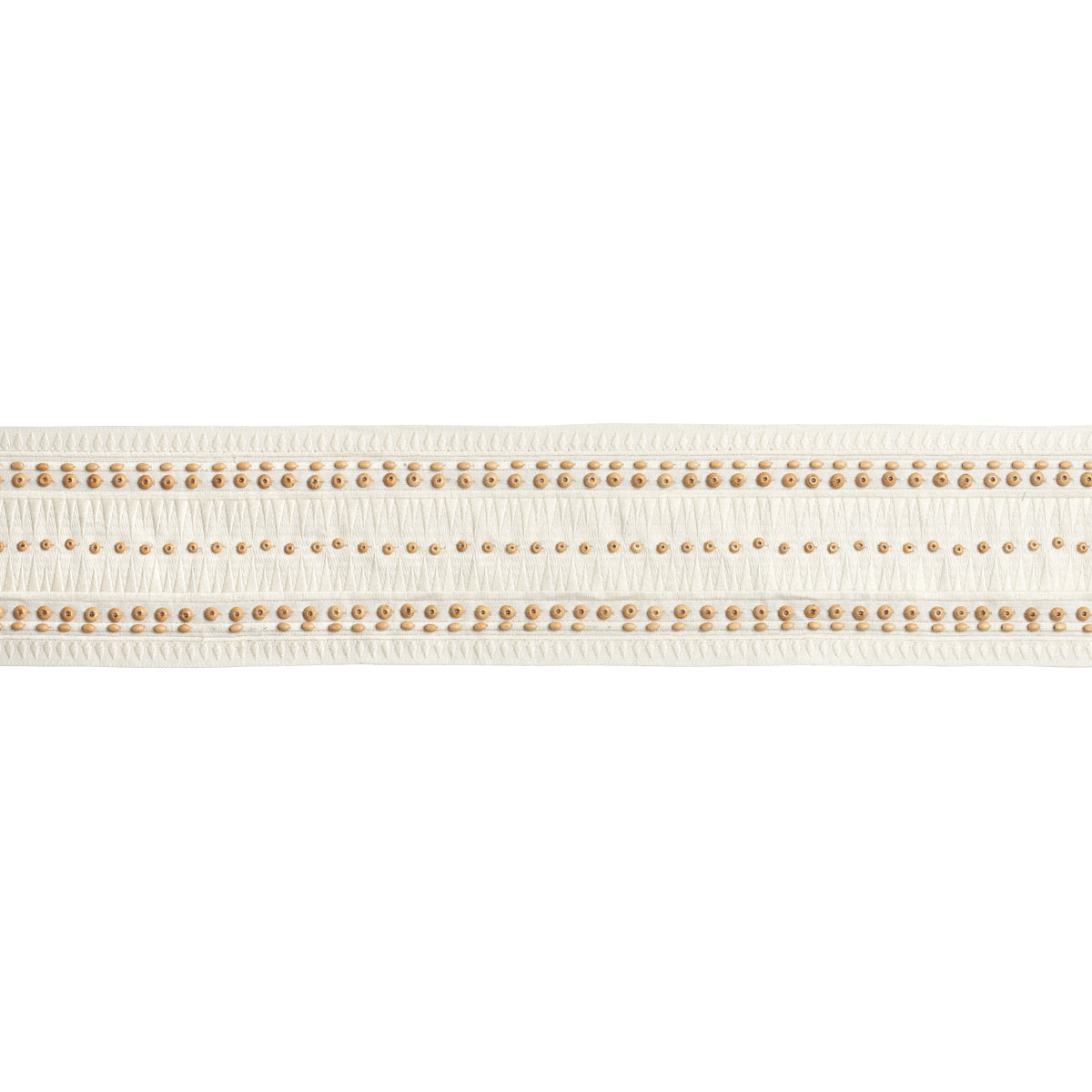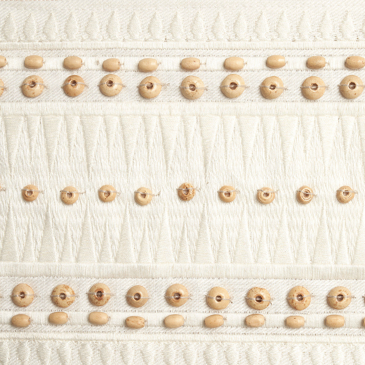 Created in collaboration with Mary McDonald, Tahiti Tape in ivory is a substantial trim embroidered with a graphic, geometric pattern and embellished with wooden beads. It is an exotic, textural finishing touch for furniture, pillows or window treatments.