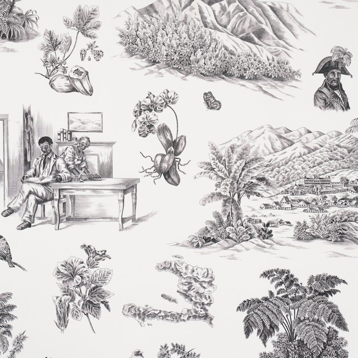 Created in collaboration with Haitian American fashion designer Victor Glemaud, Toussaint Toile wallpaper in black-on-ivory pays homage to the artist’s Caribbean heritage. Featuring historic scenes that celebrate Haiti’s liberator, Toussaint Louverture, along with the country’s native flowers, foliage and landscapes, this large-scale pattern is an inventive and illuminating take on traditional toile. Also available as a fabric.