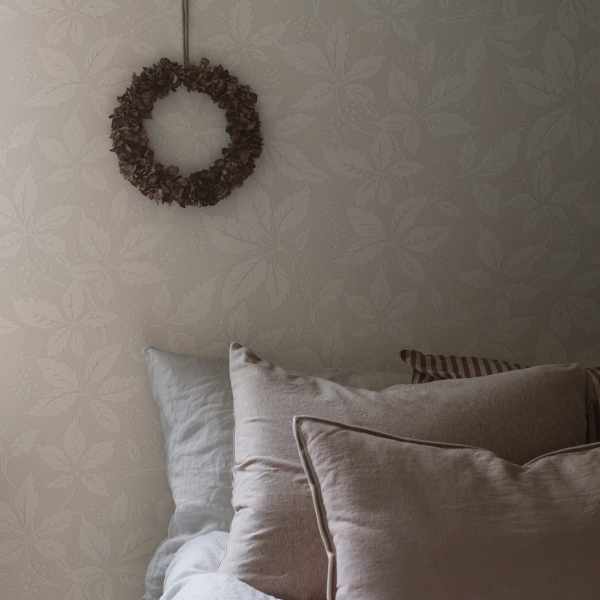Vildvin in bone is a striking illustration of the Virginia vine, a pretty plant with five leaves and clusters of dainty berries. This enchanting botanical climbs up the wall and effortlessly uplifts the surrounding space. Boråstapeter’s versatile wallpaper works wonderfully in a wide range of rooms. This product is FSC Certified. Available in North America exclusively through Schumacher.